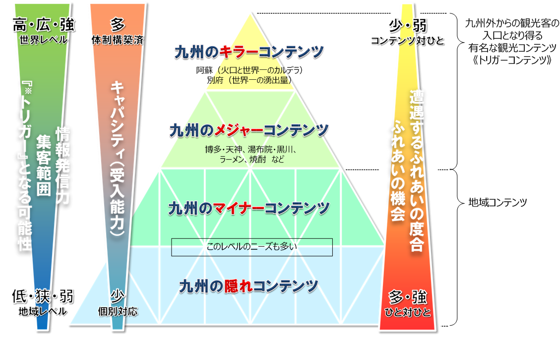 九州の観光関連サービス産業は、豊かな自然や温泉、農畜産物などを活かして発展してきました。近年は、それらに加えて産業観光やエコツーリズム、メディカルツーリズムなどが登場し「多様化」の流れがあります。また、九州の地理的な特性により、韓国、中国からの観光客が増加し「国際化」も進んでいます。さらに、九州新幹線全線開通により、国内観光の流れも大きく変化すると考えられます。